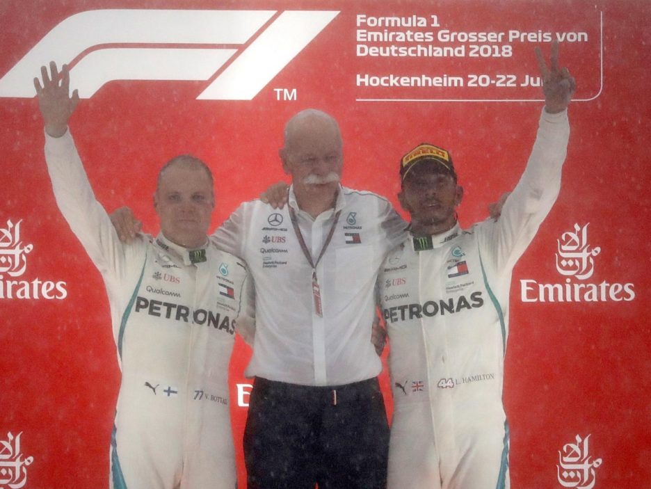 Credits: epa06904686 British Formula One driver Lewis Hamilton of Mercedes AMG GP (R), Dieter Zetsche (C), Chairman of the Board of Management of Daimler AG and Finish Formula One driver Valtteri Bottas (L) of Mercedes AMG GP (R) celebrate on the podium after the 2018 Formula One Grand Prix of Germany at Hockenheim Ring circuit in Hockenheim, Germany, 22 July 2018 EPA/RONALD WITTEK