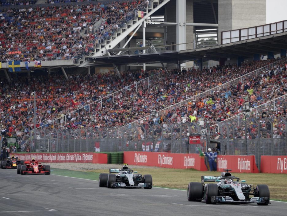 Credits: epa06904803 (R-L) British Formula One driver Lewis Hamilton of Mercedes AMG GP, Finish Formula One driver Valtteri Bottas of Mercedes AMG GP, Finnish Formula One driver Kimi Raikkonen of Scuderia Ferrari and Dutch Formula One driver Max Verstappen of Aston Martin Red Bull Racing in action during the 2018 Formula One Grand Prix of Germany at the Hockenheimring in Hockenheim, Germany, 22 July 2018. EPA/VALDRIN XHEMAJ