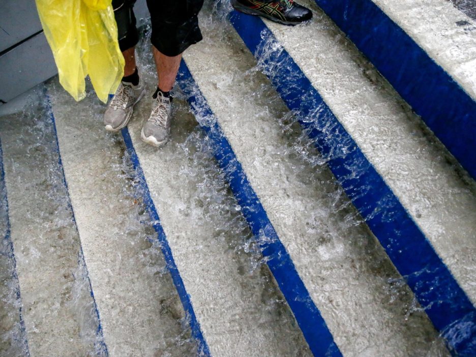 Credits: epa06904640 Heavy rain falls down a stairway at the 2018 Formula One Grand Prix of Germany at Hockenheim Ring circuit in Hockenheim, Germany, 22 July 2018. EPA/RONALD WITTEK