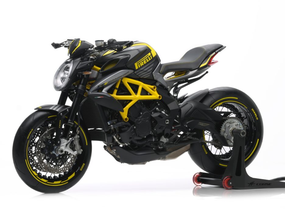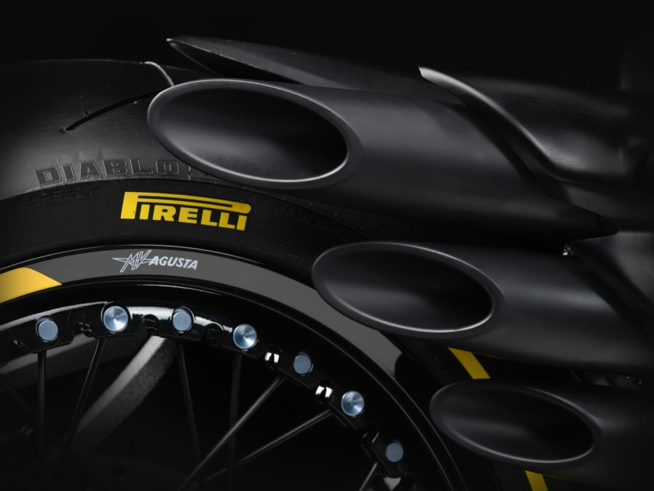 La MV Agusta Dragster 800 RR Pirelli monta pneumatici Pirelli Diablo Supercorsa SP (120/70 ZR17 anteriore e 200/55 ZR17 posteriore). I fianchi colorati sono optional.