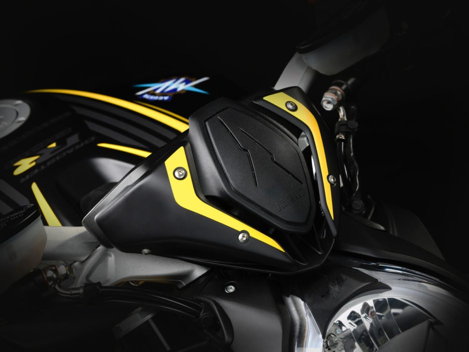 La MV Agusta Dragster 800 RR Pirelli è disponibile in due colorazioni: base nera opaca con inserti lucidi verniciati in giallo e base bianca lucida con inserti blu.