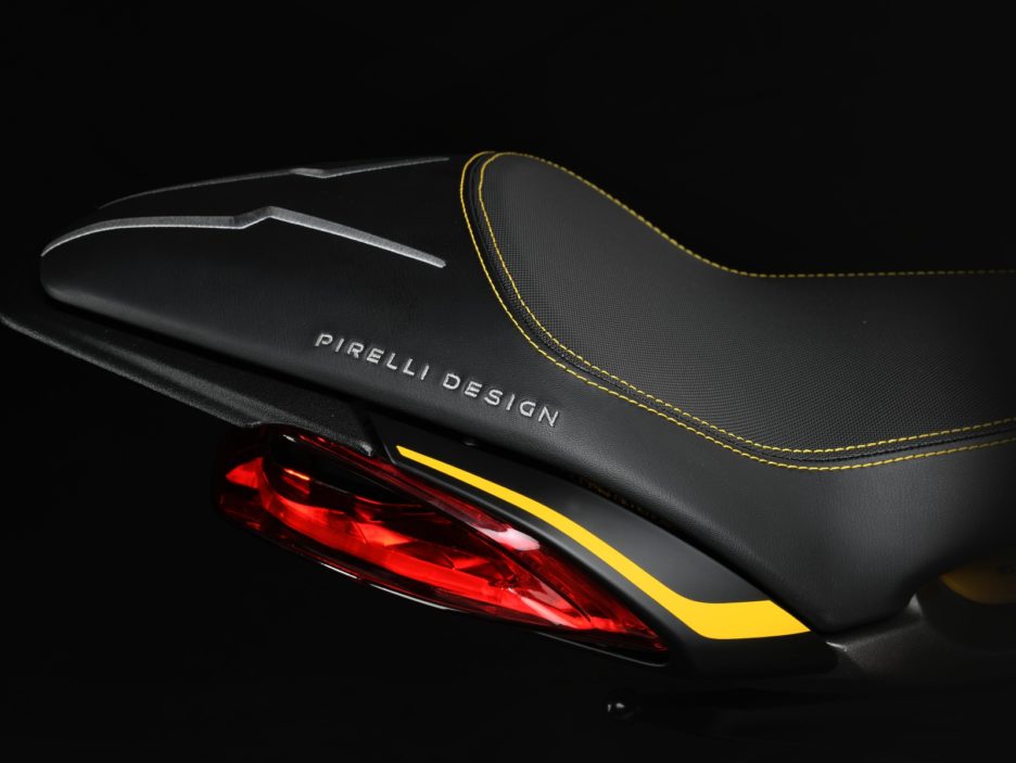 La sella – realizzata ad hoc dal Centro Ricerche Castiglioni – presenta una doppia texture con cuciture in contrasto e il “flash” distintivo del Diablo ricamato a impreziosire il codino firmato Pirelli Design mentre sui terminali di scarico è stata applicata una vernice speciale a base ceramica resistente alle alte temperature.
