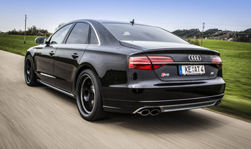 Non è cosa di tutti i giorni, per noi, avere a che fare con una ammiraglia “arrabbiata” del calibro della tedesca Audi A8.Sulle rotte autostradali tedesche, però, è più comune incappare in incontri ravvicinati con questo tipo di incrociatori, a loro agio la dove i limiti non esistono.A fare l’ultima messa a punto della super limousine di Ingolstadt, l’Audi S8, è stato il preparatore teutonico specializzato ABT che ha messo mano, di nuovo (dopo averlo fatto con le RS6 e RS7) sul mastodontico 8 cilindri a V da 4 litri della Casa dei Quattro Anelli.Di serie, ricordiamo, la cavalleria della berlina top targata Audi ammonta a ben 520 CV con una coppia di 650 Nm. Dopo la revisione di ABT i puledri della S8 aumentano notevolmente, fino a 640 CV. Schizza in alto anche la coppia, in questo caso di 780 Nm. Via anche il limitatore, senza il quale si accelera tranquillamente fino a 280 km/h. E per dare un tocco estetico “da battaglia” alla Audi S8, ABT propone grandi cerchi in lega da 20 o 21 pollici a scelta verniciati in nero Mystic attraverso i quali si mettono in mostra gli enormi dischi in carboceramica. Il tutto avvolto da pneumatici da 275/35 R20 o R21.L’assetto è schiacciato a terra, ribassato di 25 mm, e l’impianto di scarico originale è sostituito con l’ABT Muffler System dotato di 4 terminali che diffondono a gran voce l’urlo del V8.