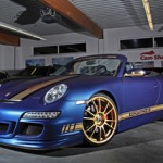 Le sottilissime pellicole adesive sono sempre più la tecnica, economica e di qualità, scelta nel mondo del tuning per “imbellettare” auto sportive e supercar di tutti i tipi.In questo caso, i tedeschi di Cam Shaft (preparatore specializzato proprio in questa tecnica) mostrano cosa si può fare con una Porsche 997 Cabriolet spendendo poche migliaia di Euro.Lo strato blu “Frozen” costa 2.100 Euro ai quali andranno aggiunti 780 Euro per gli adesivi da gara in color “oro opaco” più ulteriori 720 Euro per i bordi, incluso il frontale e i laterali delle portiere.La trasformazione estetica della Porsche 997 Cabriolet eseguita da Cam Shaft culmina con nuovi spettacolari cerchi in lega OZ Ultraleggera dorati da 20 pollici avvolti da pneumatici ad alte prestazioni da 235/25 ZR20 all’anteriore e da 305/20 ZR20 al posteriore.Completano il quadro, la grembialatura anteriore GT3 e le minigonne laterali Techart.