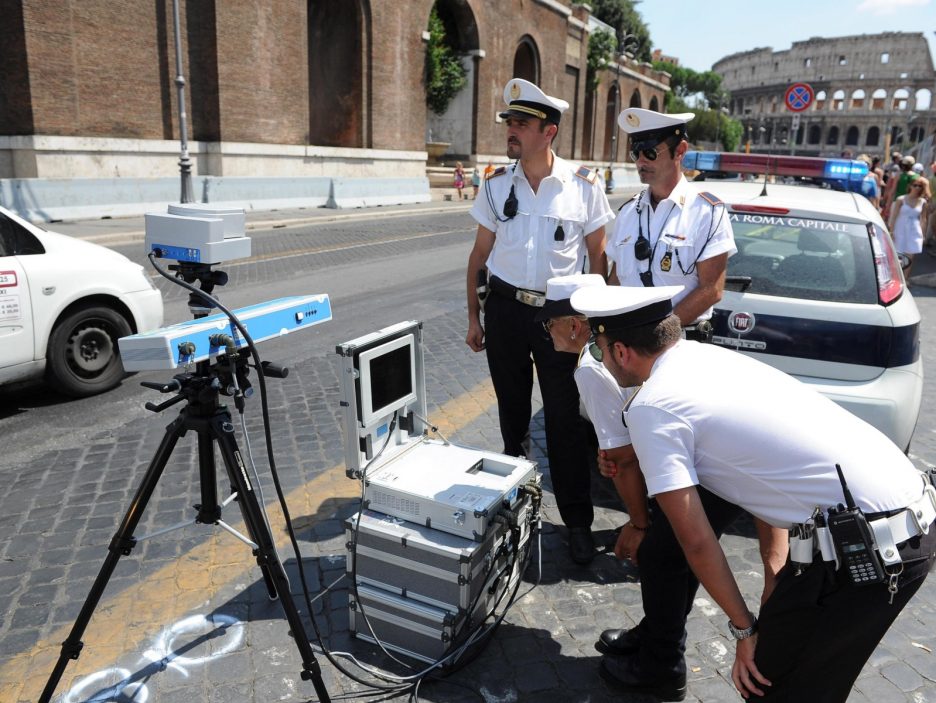 Credits: Agenti della Polizia Municipale osservano il dispositivo elettronico per il controllo della velocità in Via dei Fori Imperiali a Roma, 10 agosto 2013. Fori imperiali ‘sorvegliati speciali’ con autovelox mobili per controllare che tutti rispettino il limite di 30 chilometri orari, bus compresi. Nessuna scusa per i romani: su richiesta del Campidoglio già da ieri tutti i panelli elettronici della Capitale, che informano gli automobilisti sulla viabilità, riportano la notizia dell’inizio dei controlli. ANSA / MAURIZIO BRAMBATTI