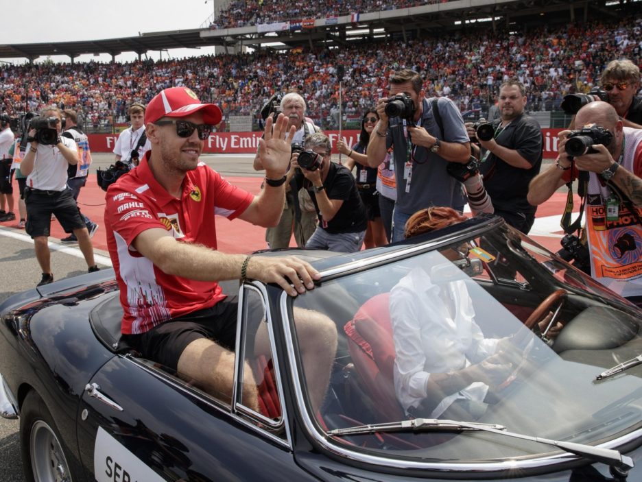 Credits: epa06904120 German Formula One driver Sebastian Vettel of Scuderia Ferrari greet his supporters during the drivers track parade ahead of the 2018 Formula One Grand Prix of Germany at the Hockenheimring in Hockenheim, Germany, 22 July 2018. EPA/VALDRIN XHEMAJ