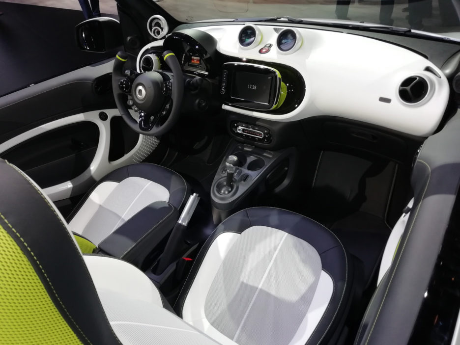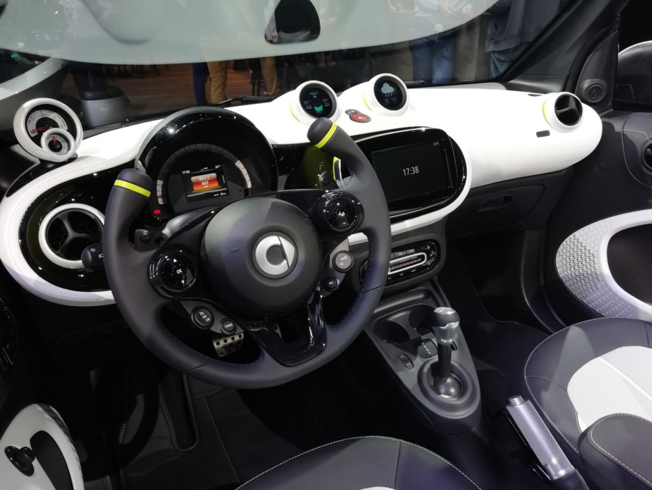 All’interno la Smart forease Concept presentata al Salone di Parigi 2018 è priva di bocchette di ventilazione centrali (effettivamente inutili su una vettura creata per restare sempre scoperta), rimpiazzate da due display circolari.